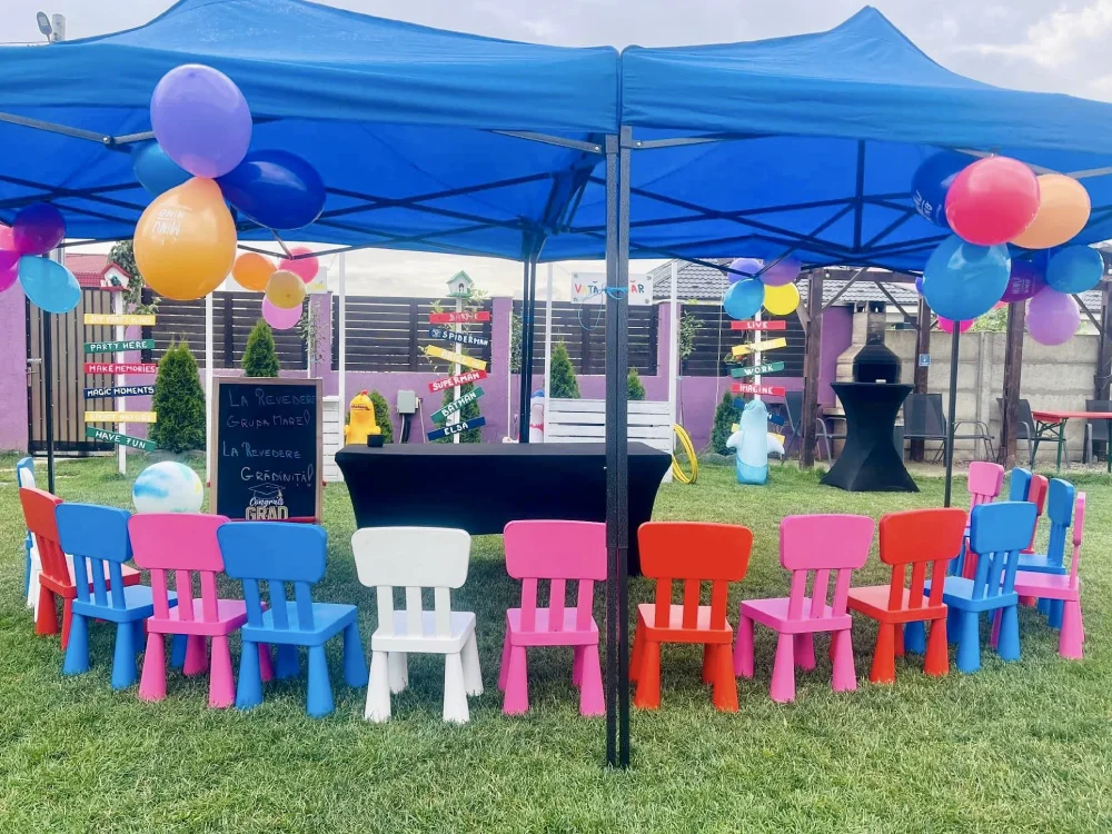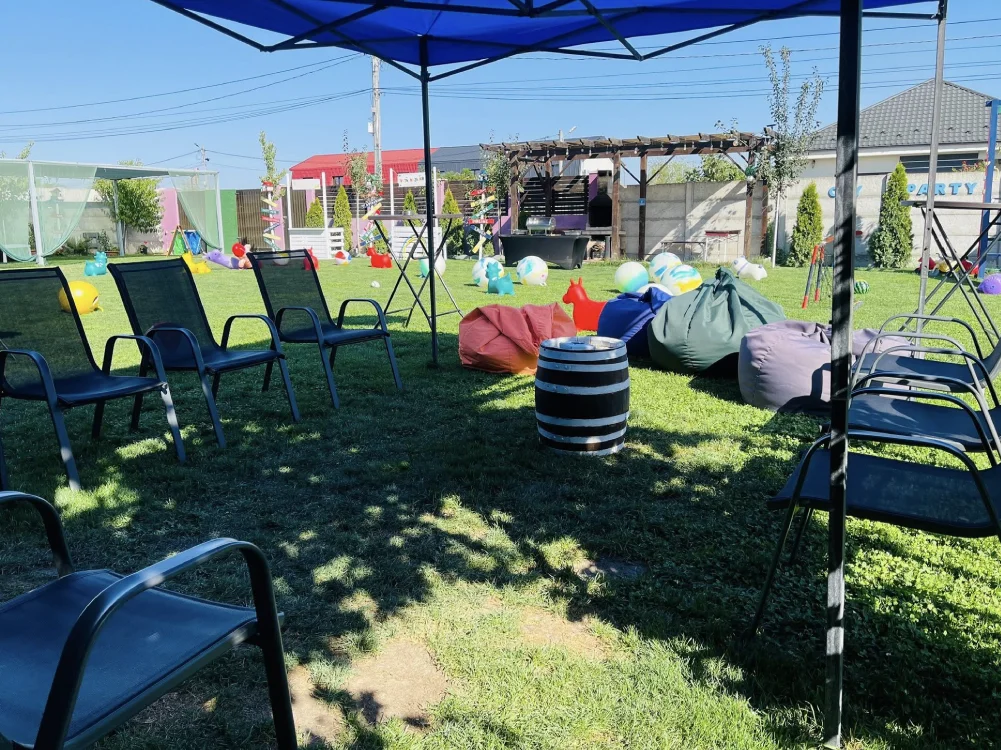 Spațiul include și facilități pentru părinți — foișor cu mese și scaune, bar, aparat de cafea și zonă de grătar — pentru confort în timpul petrecerii. Joy Party Place este potrivit pentru petreceri dinamice în aer liber pentru copii de diverse vârste, cu opțiuni de personalizare în funcție de preferințele familiei.